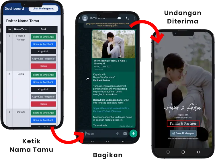 Cukup ketik nama tamu yang kamu undang lalu share dengan mudah ke kontak mereka